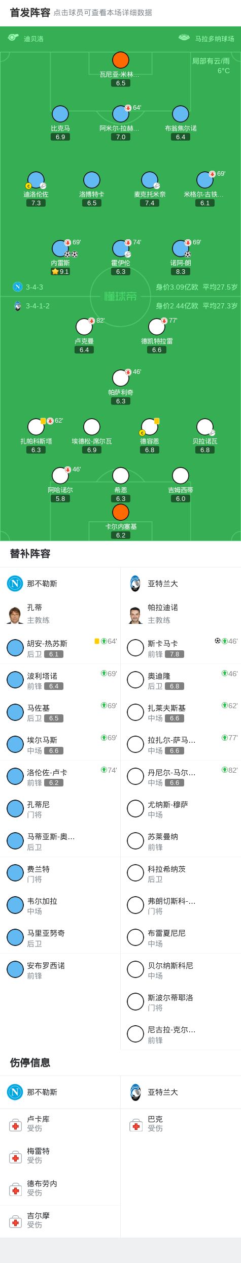 北京時(shí)間11月23日意大利足球頂級(jí)聯(lián)賽 聯(lián)賽 第12輪,那不勒斯主場(chǎng)對(duì)陣亞特蘭大。那不勒斯內(nèi)雷斯梅開二度,諾阿-朗破門。亞特蘭大斯卡馬卡破門。最終比分那不勒斯 3-1 亞特蘭大。