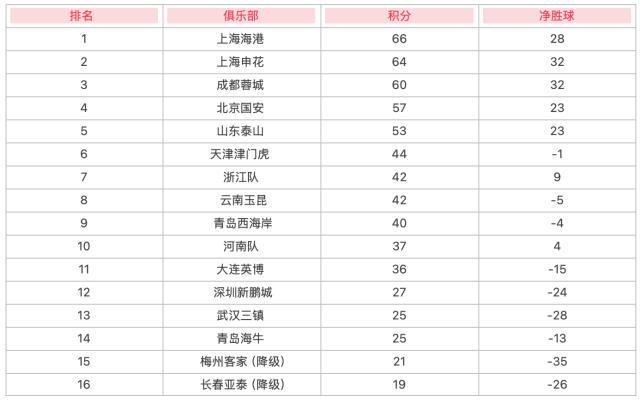 中超30輪積分榜:海港積66分奪冠 梅州亞泰降級