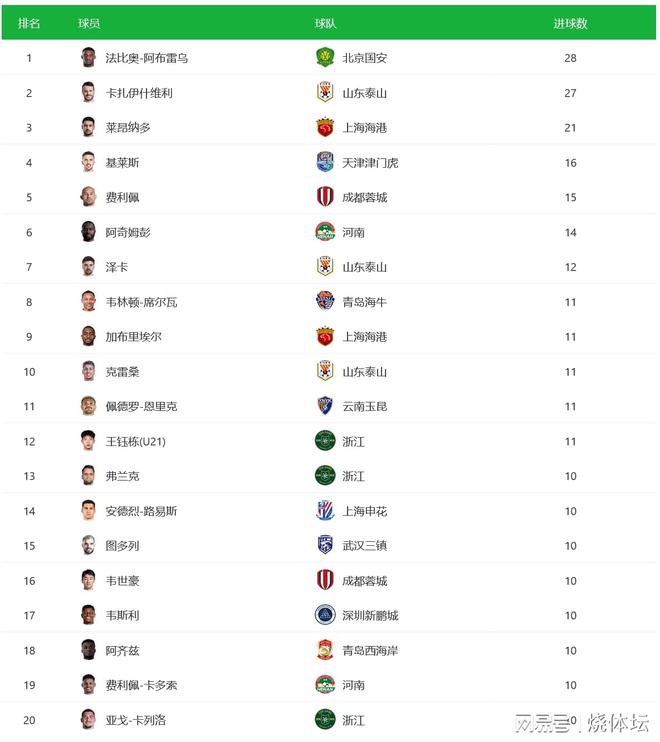 此外,本土球員王鈺棟11球第一,韋世豪10球排名第二,吳曦、譚龍各自打進9球。