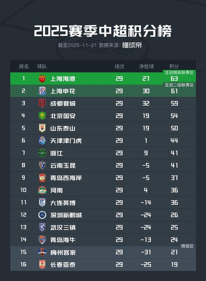 海港領先成都4分,這讓他們至少已經確保可以獲得下賽季亞冠資格。只要末輪取分,他們將在奪冠的同時鎖定下賽季亞冠精英聯賽的直通名額。